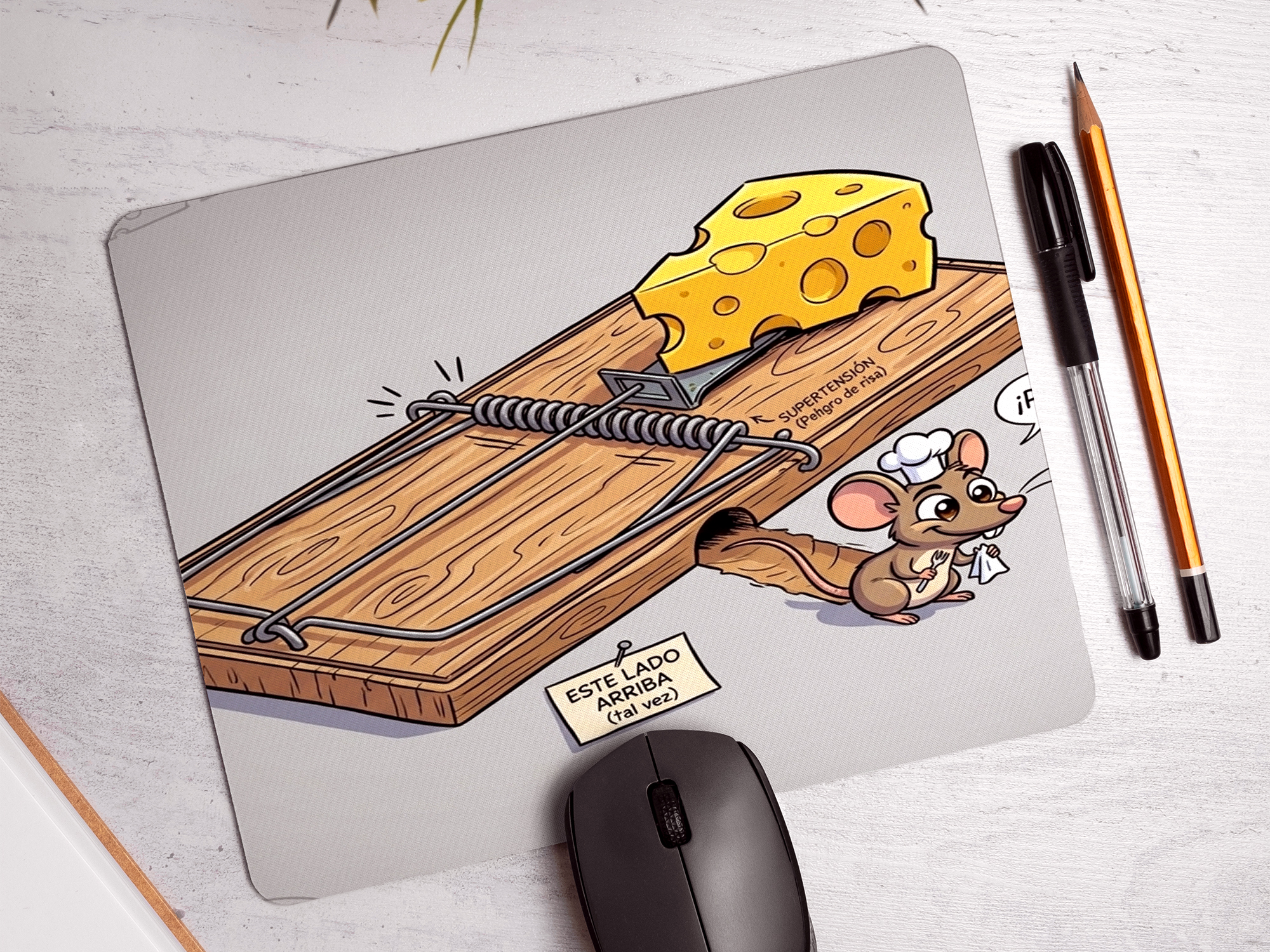 ¿Buscas un accesorio de escritorio que rompa con lo convencional? Nuestro modelo “Trampa para Ratones” es la combinación perfecta de ingenio y funcionalidad. Con un diseño hiperrealista que simula una clásica trampa de madera, esta alfombrilla de ratón original hará que todas las miradas se detengan en tu escritorio. Es el regalo ideal para informáticos, gamers o cualquier persona que pase horas frente al ordenador y quiera añadir una nota de humor a su jornada.