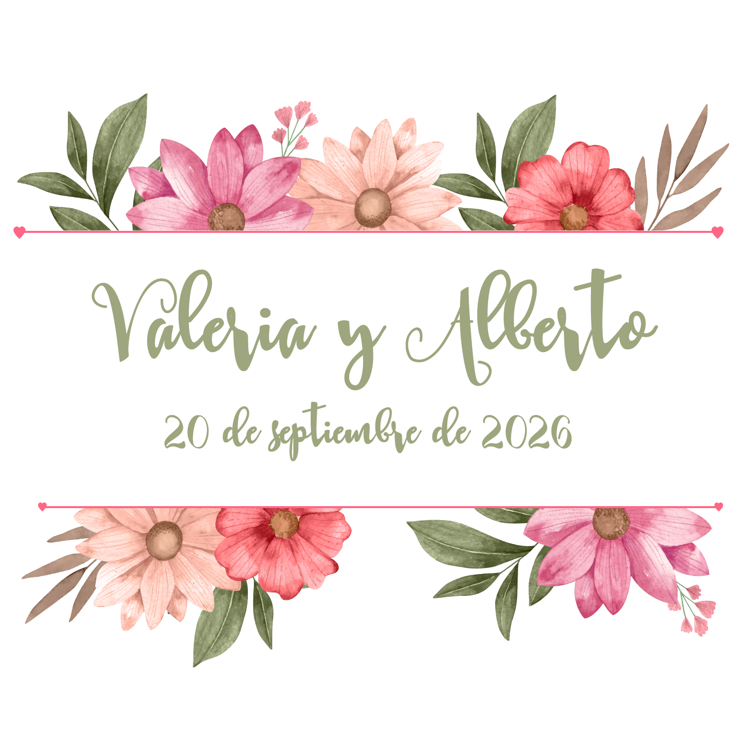 El diseño central presenta una emotiva frase o también nombres o fechas importantes, que es realzada por un bello dibujo floral en intensos tonos. Este patrón no solo añade un toque de pasión, sino que enmarca la dedicatoria con elegancia y romanticismo.