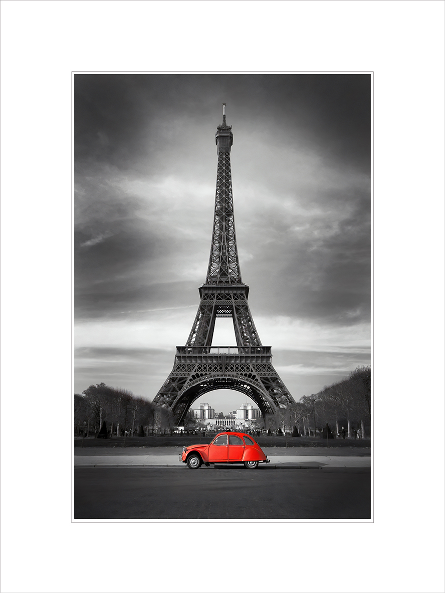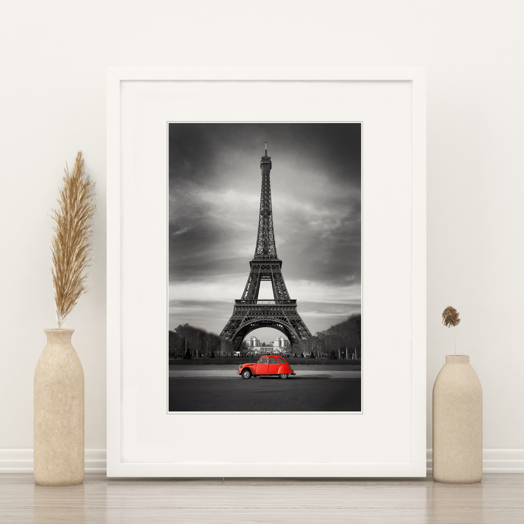 Contraste de Color Superior: El rojo del Citroën 2 CV destaca con una saturación profunda sobre el granulado artístico del papel, mientras que los grises de la Torre Eiffel mantienen una escala de grises rica y detallada.