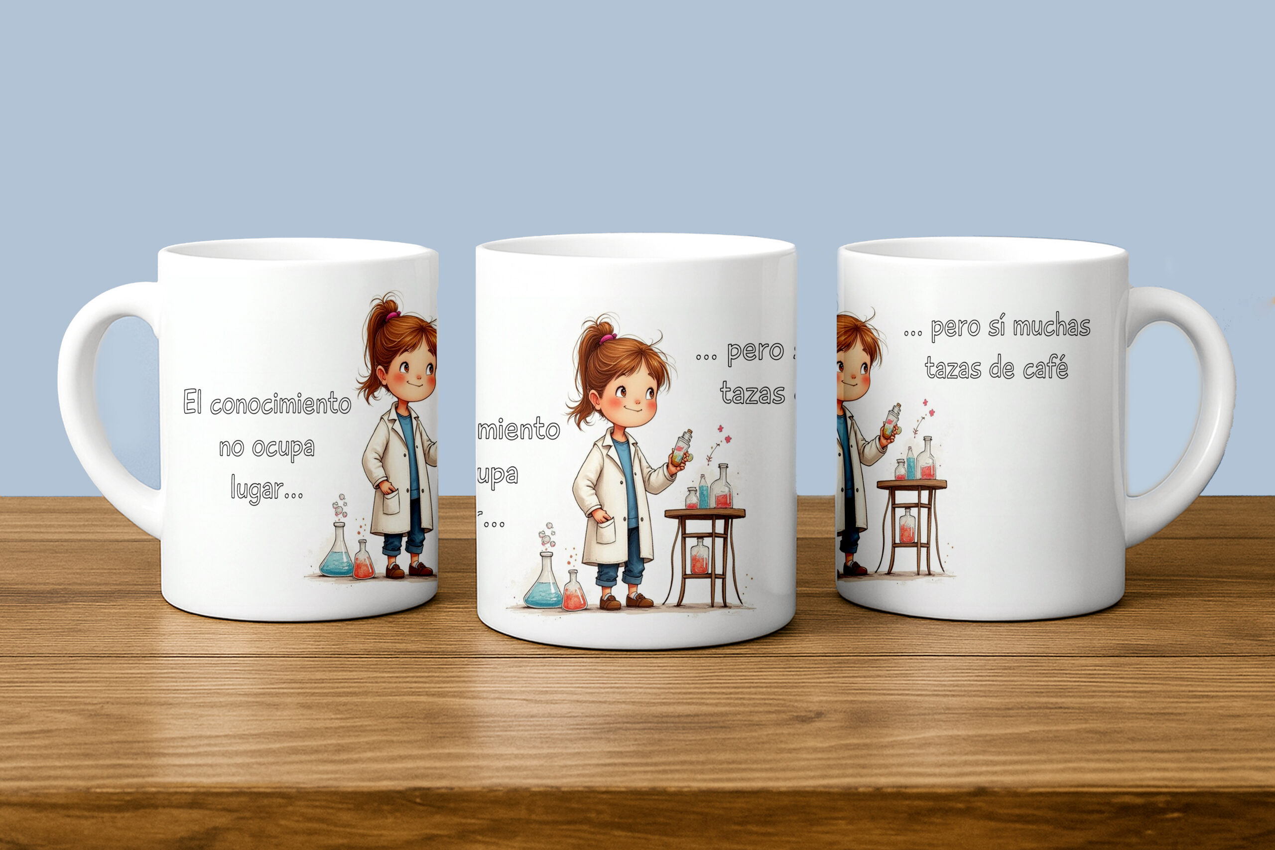 Personaliza la tuya ahora y lleva la ciencia a cada sorbo o compra nuestra taza divertida “El conocimiento no ocupa lugar… pero sí muchas tazas de café”