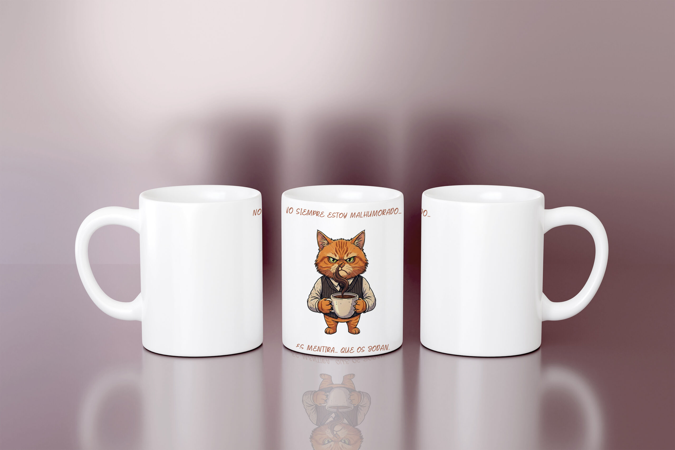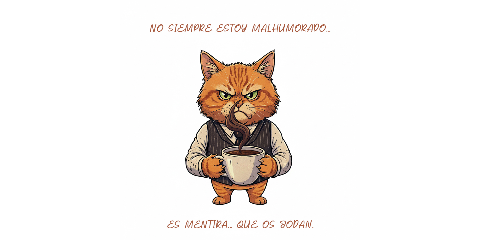 Protagonizada por un adorable pero gruñón gato tomando café con una expresión impagable de enfado, esta taza es la forma ideal de expresar tus sentimientos sin decir una palabra. El diseño se complementa con el hilarante y honesto mensaje: “No siempre estoy malhumorado… es mentira… que os jodan.” ¡Una declaración de principios que resonará con cualquier amante del café y los gatos!