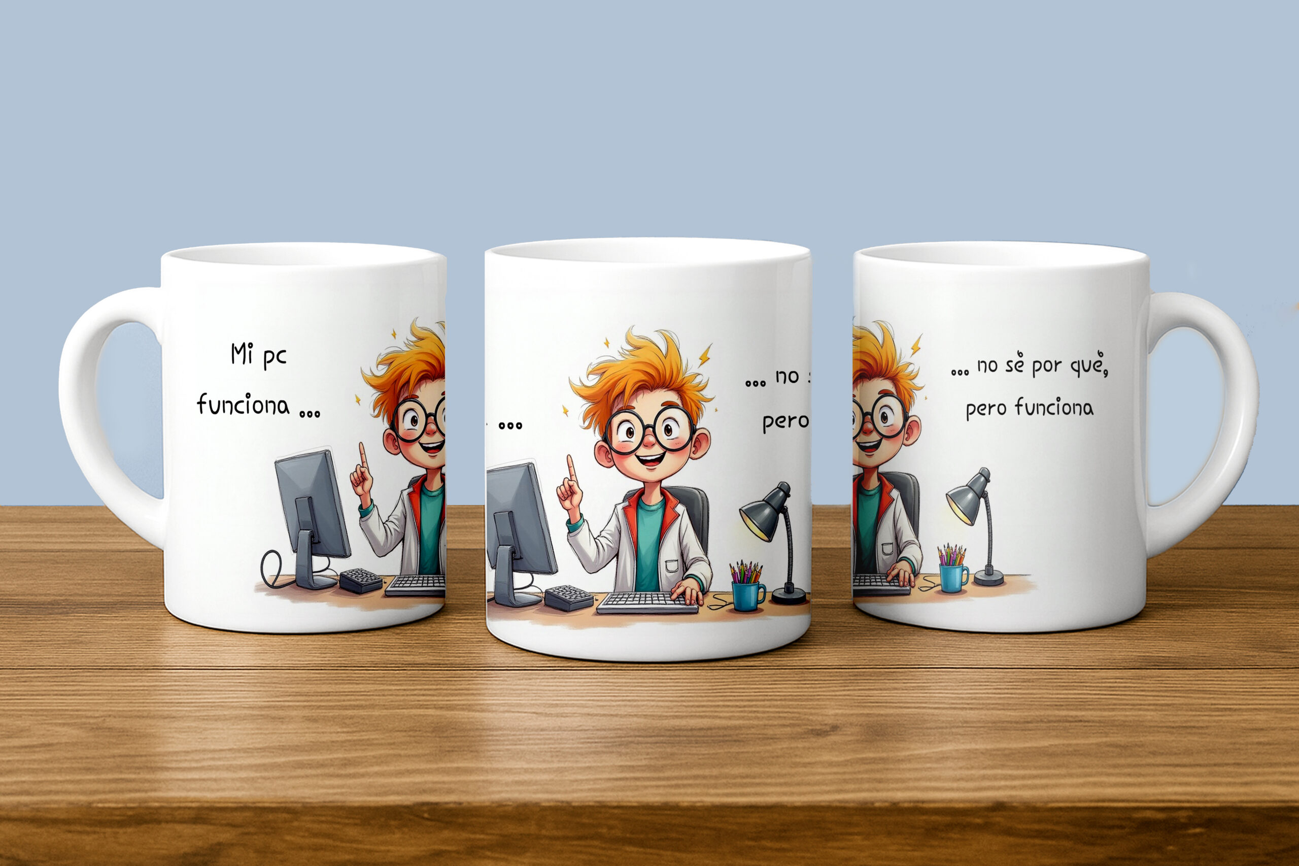 Personaliza la tuya ahora y lleva tus sistemas a cada sorbo o compra nuestra taza divertida “Mi pc funciona, no sé por qué, pero funciona”