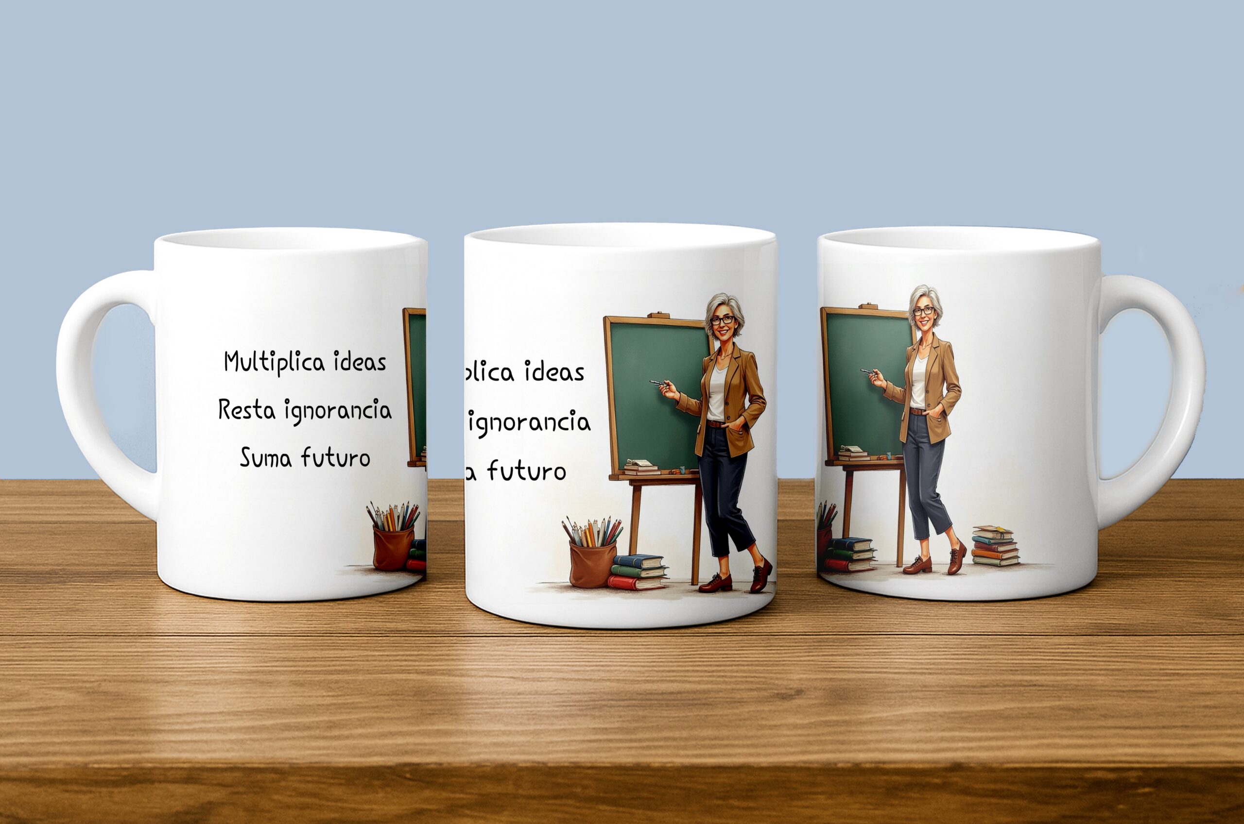 La taza de cerámica perfecta para profesores y profesoras con sentido del humor. Diseño exclusivo con la frase en la taza divertida “Multiplica ideas, resta ignorancia, suma futuro”. ¡Regalo ideal!